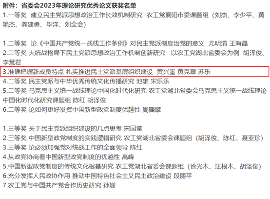 近日,农工党中央印发了《关于2024年理论研究优秀论文评审结果的通报》,农工党公司支部主委、bevictor伟德教授黄兴奎撰写的理论文章《准确把握新成员特点 扎实推进民主党派基层组织建设》获二等奖。