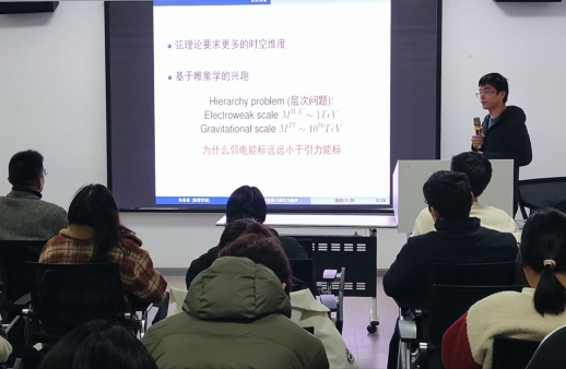 朱春春以《额外维与特征引力波信号》为题,围绕现代物理未解之谜“额外维”展开,介绍了利用厚膜模型揭示的Kaluza-Klein共振态及其超长寿命特性,并讲解了这类共振态产生的“引力回声”信号——其机制与天体物理回声截然不同,为未来通过引力波观测验证额外维存在提供了新思路。