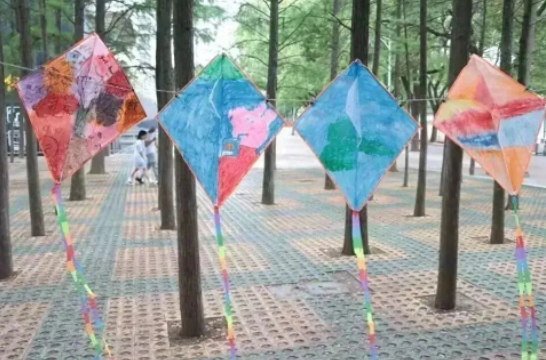 最后,同学们制作出独属自己的风筝,以风筝为载体,绘画出自己的心中所想,将自己制作的风筝悬挂在林间,制成独具一格的风筝展览,内心的美好尽情展现在风筝之上。