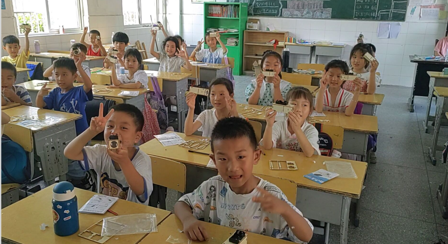 在动手实践环节,开展了“水上飞机”和“幻灯机”物理小制作,志愿者们手把手指导可爱的孩子们动手实践。孩子们个个“化身”为科技小达人,迫不及待地从材料包中拿出制作材料跟随老师的指导进行创作,一些同学不满足于“基础款”的成品,在此基础上加上自己的小创意,升级成“顶配款”。